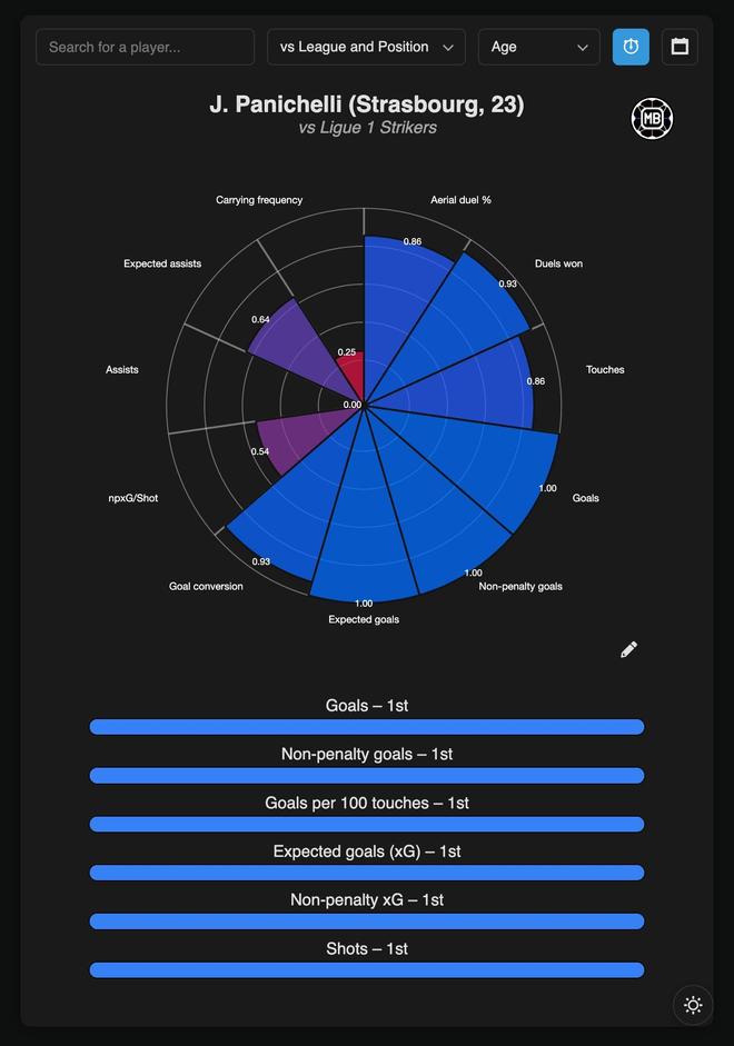帕尼切利本赛季对比法甲其他射手数据